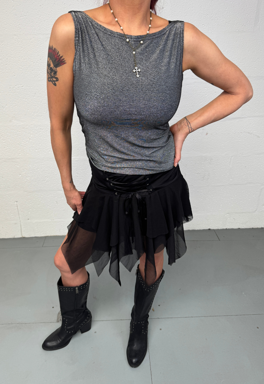 silver sparkle slash neck top