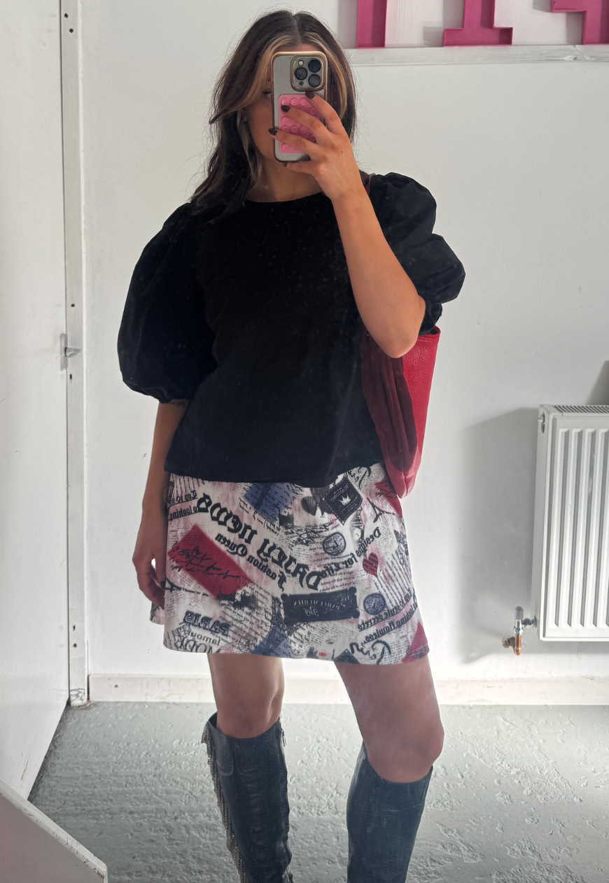 -Super stretchy newspaper printed crepe fabric with slight texture.