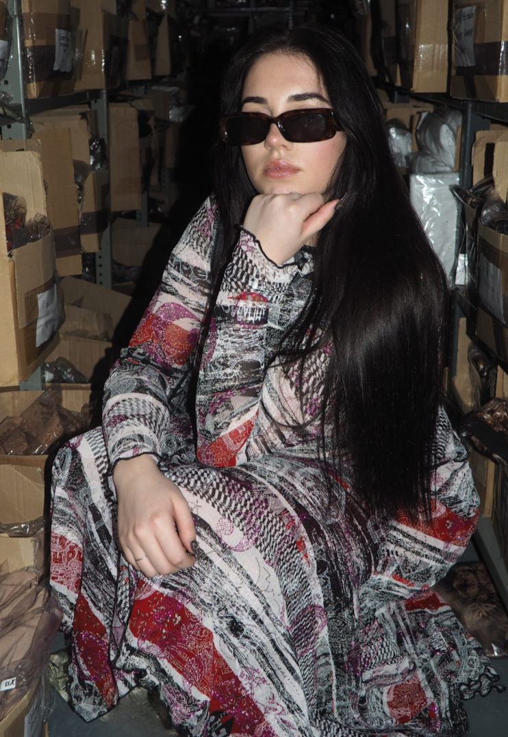 Care guide: Made from dead stock fabrics. Hand wash only in warm water. Hang to dry. Do not iron. Do not tumble dry. Do not bleach. Glitter will fall off fabric so make sure to wash before wearing to lift excess glitter